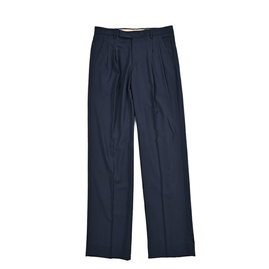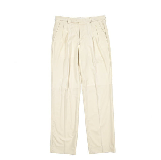 腰周りには、深めの股上にプリーツを採用し、リラックスしたシルエットを形成。そして、5cm幅という極太のウエストバンド(マーベルト)が、高い位置での構築的なウエストラインを生む、まさにイギリスらしいクラシカルな仕立てとなっています。