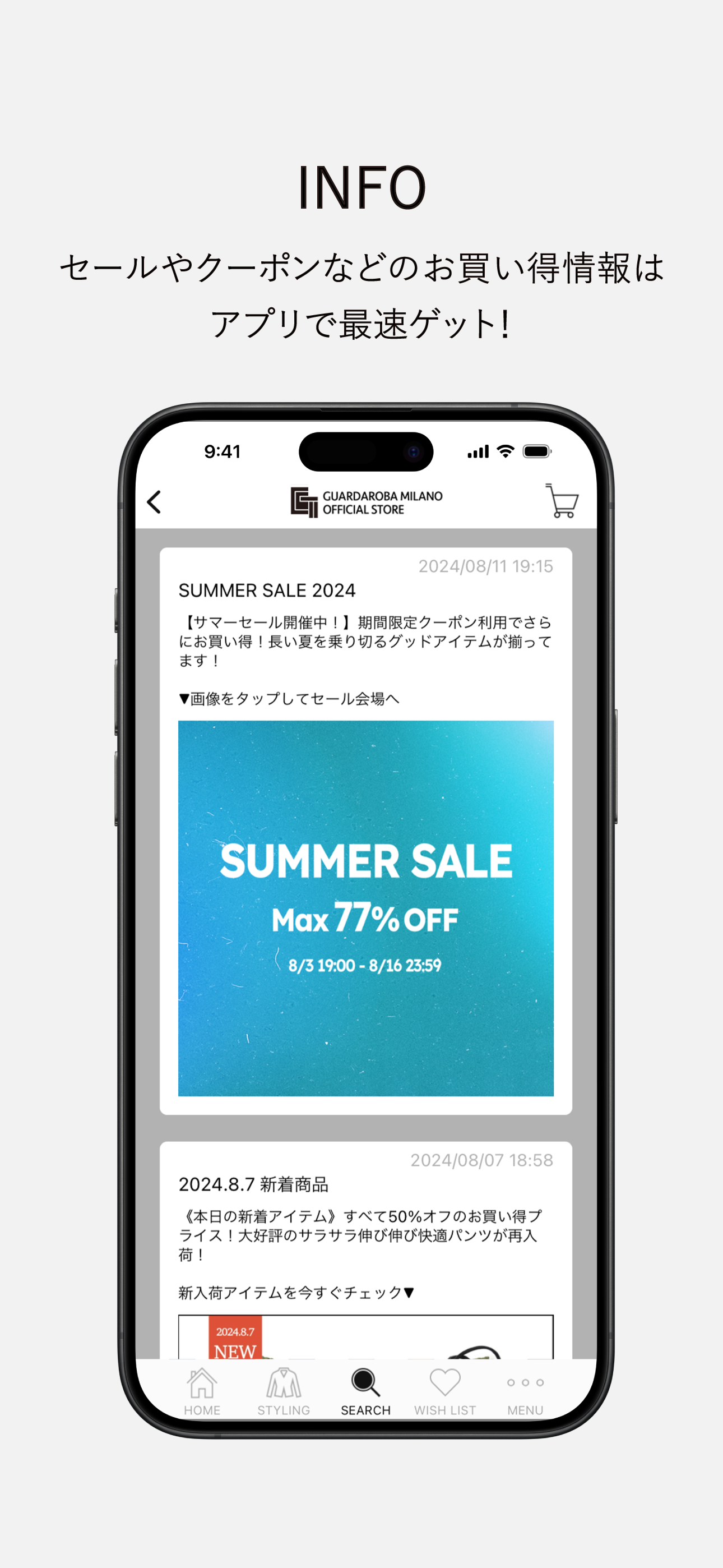 お買い物をもっと気軽に、もっと探しやすく。ドレス/カジュアル問わず大人の男性にふさわしいアイテムを豊富にラインナップ。新着アイテムやプロモーション情報のお知らせ、さらにアプリ限定の特典もご用意しております。ガルダローバミラノ公式アプリでお買い物をお楽しみくださいませ。